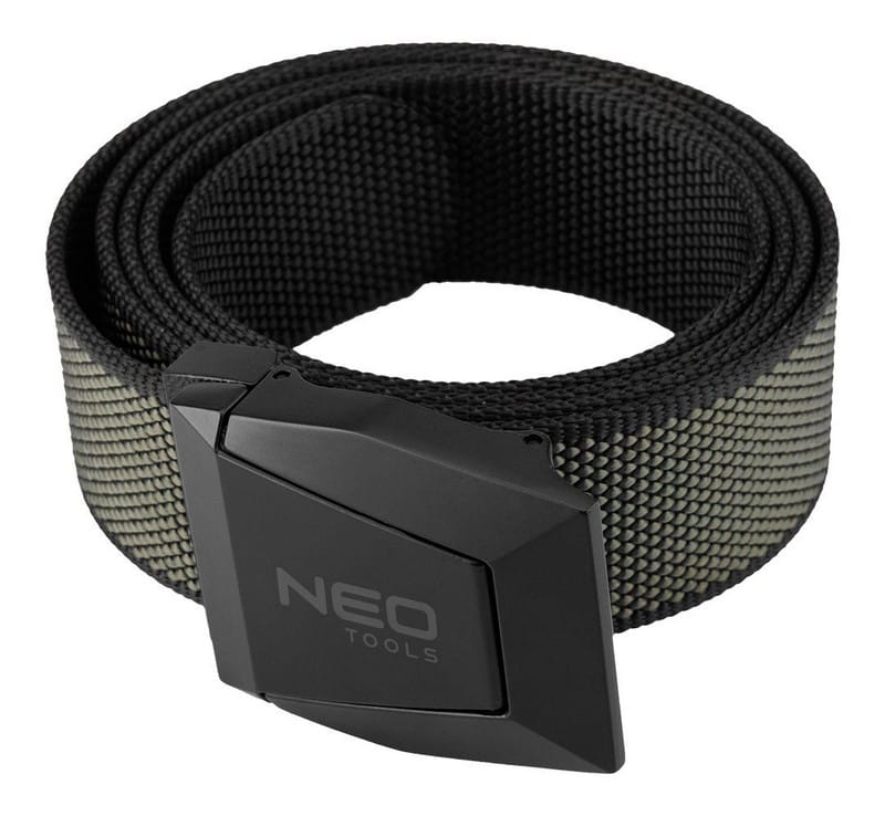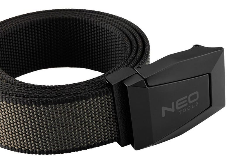 Wyposażony jest w klamrę wykonaną ze stopu cynku z logo NEO TOOLS, zapewniającą trwałość i stabilne zapięcie.