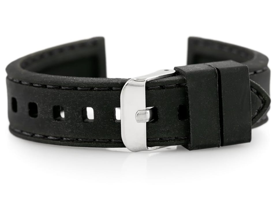 Gumowy pasek w kolorze czarnym z czarnymi przeszyciami.