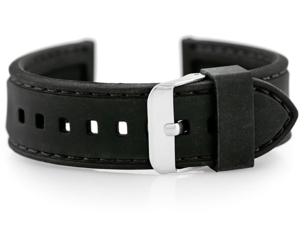 Gumowy pasek w kolorze czarnym z czarnymi przeszyciami.