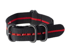 Pasek parciany do zegarka w kolorze czarnym z czerwonym detalem. Klamerka metalowa w kolorze czarnym.