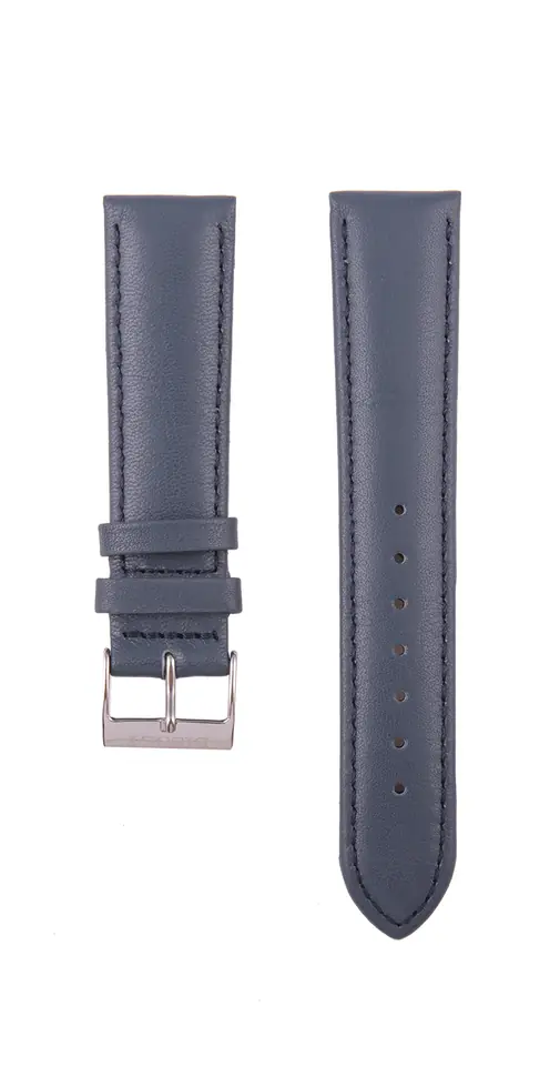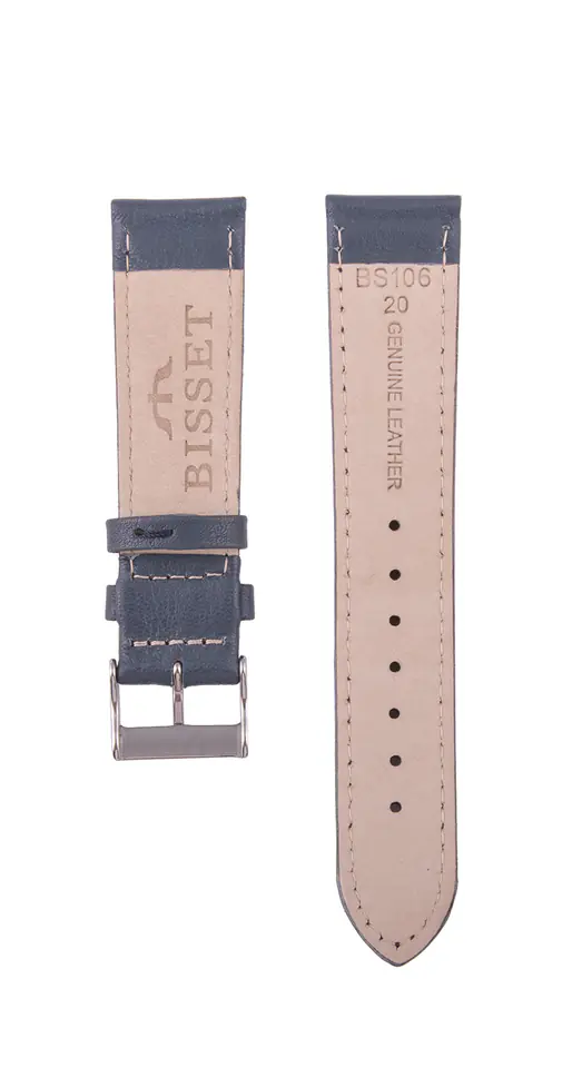 Pasek ze skóry naturalnej w kolorze ciemnoniebieskim z ciemnoniebieskimi przeszyciami. Klamerka ze stali szlachetnej w kolorze srebrnym.
