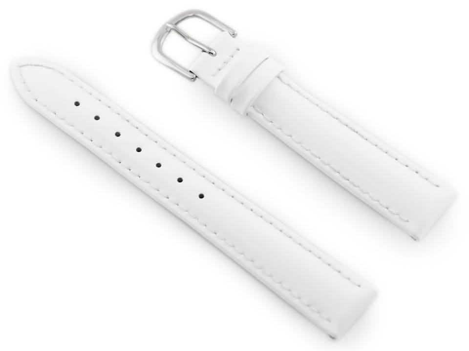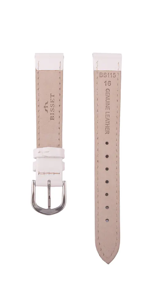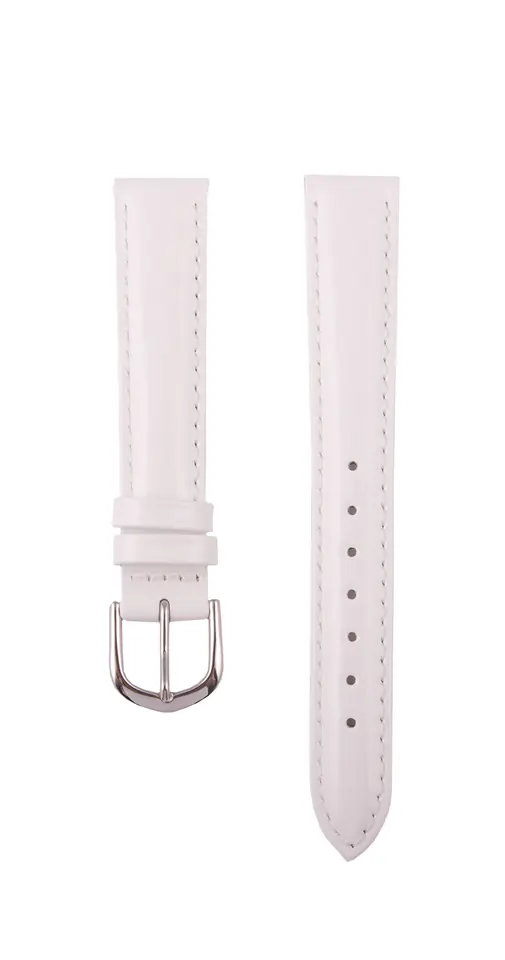 Lakierowany pasek ze skóry naturalnej w kolorze białym z białymi przeszyciami. Klamerka ze stali szlachetnej w kolorze srebrnym.
