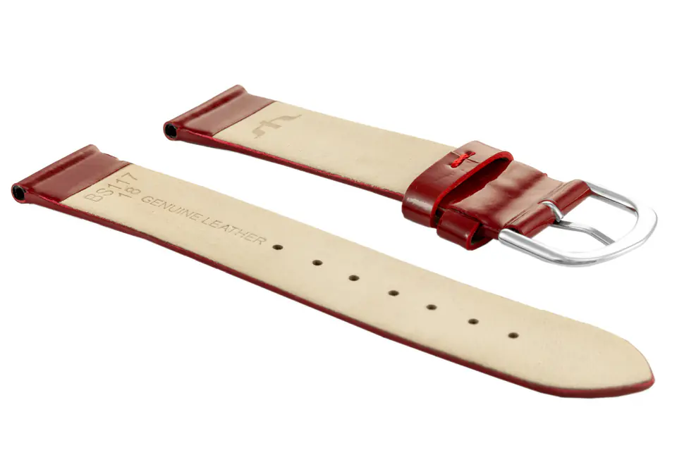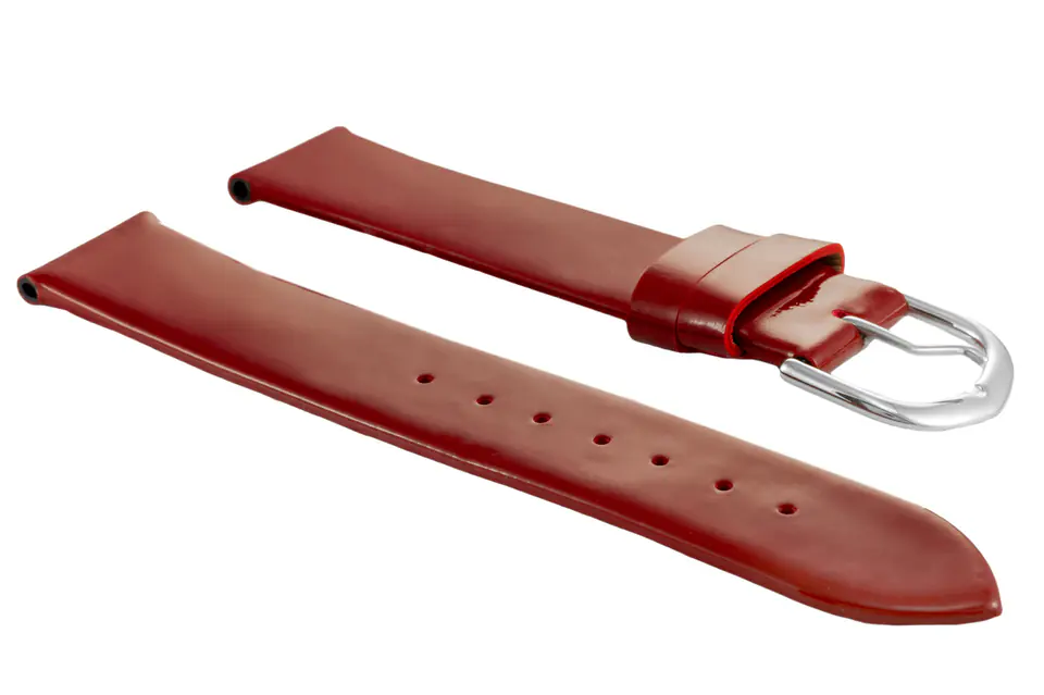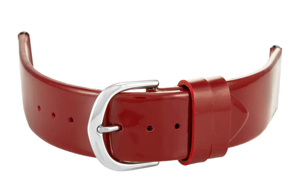 Lakierowany pasek ze skóry naturalnej w kolorze bordowym. Klamerka ze stali szlachetnej w kolorze srebrnym.