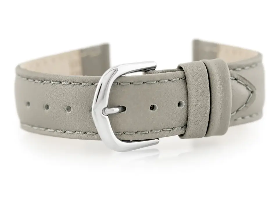 Pasek ze skóry naturalnej w kolorze szarym z szarymi przeszyciami. Klamerka ze stali szlachetnej w kolorze srebrnym.