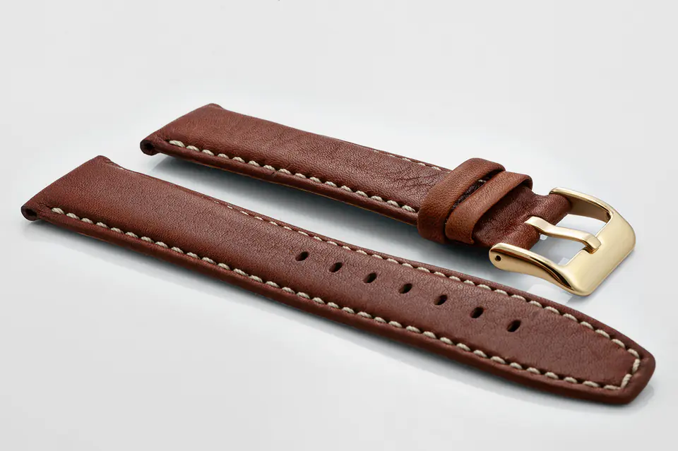 Pasek ze skóry naturalnej w kolorze ciemnobrązowym z beżowymi przeszyciami. Klamerka metalowa w kolorze złotym.