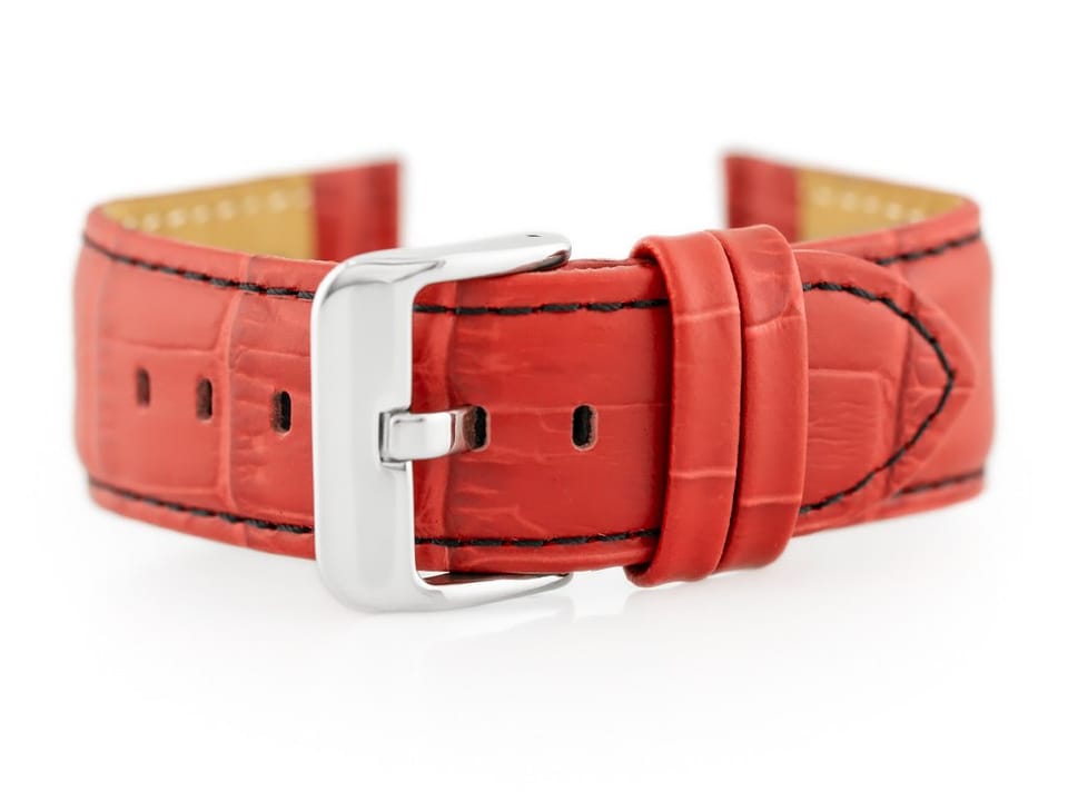 Pasek ze skóry naturalnej w kolorze czerwonym z granatowym przeszyciami. Klamerka ze stali szlachetnej w kolorze srebrnym.