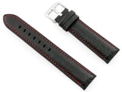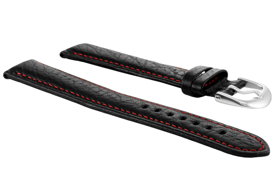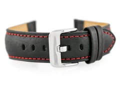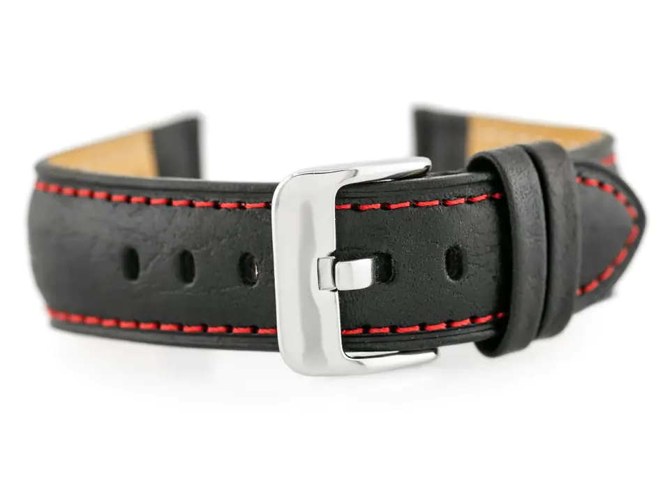 Pasek ze skóry naturalnej w kolorze czarnym z czerwonymi przeszyciami. Klamerka ze stali szlachetnej w kolorze srebrnym.