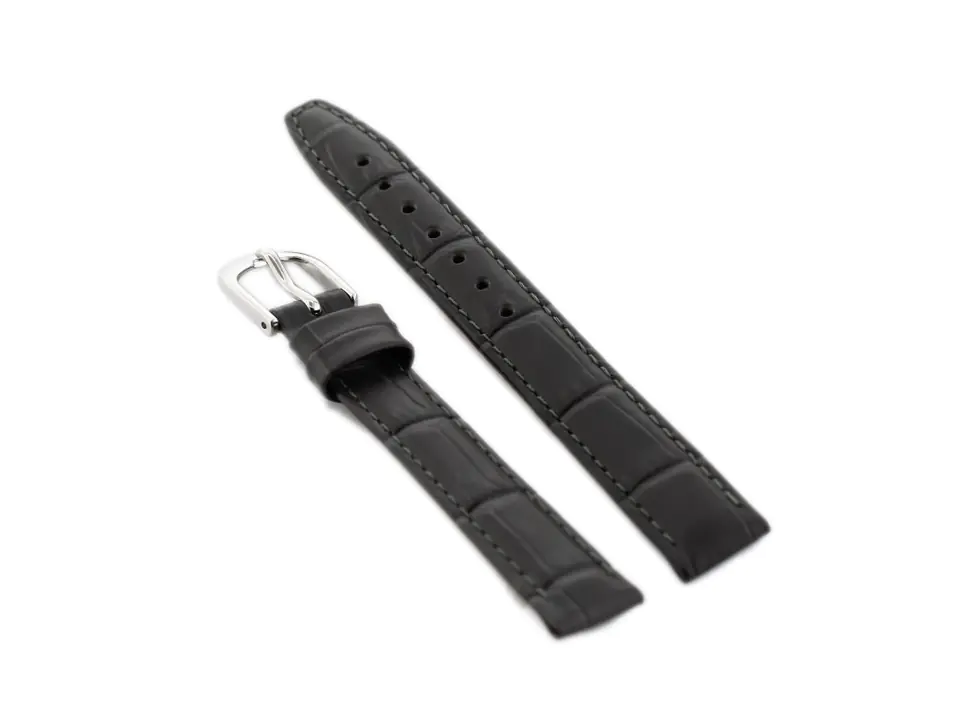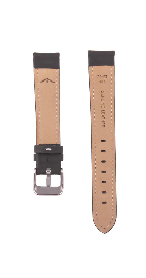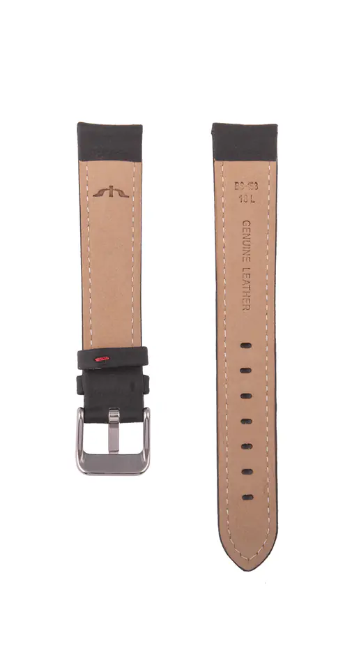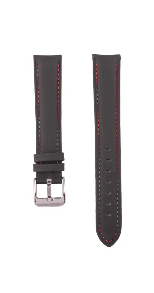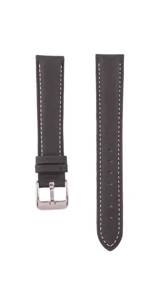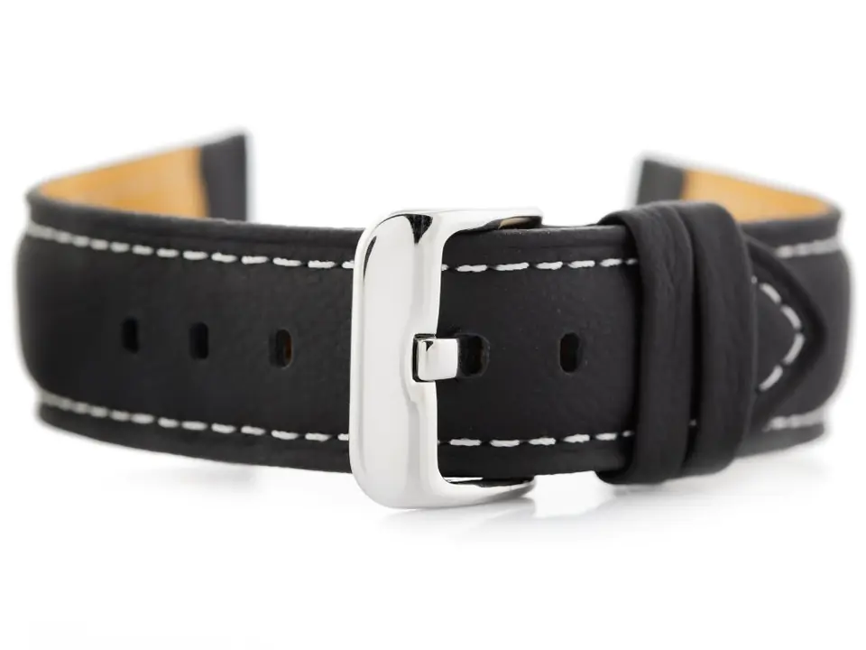 Pasek ze skóry naturalnej w kolorze czarnym z białymi przeszyciami. Klamerka ze stali szlachetnej w kolorze srebrnym.
