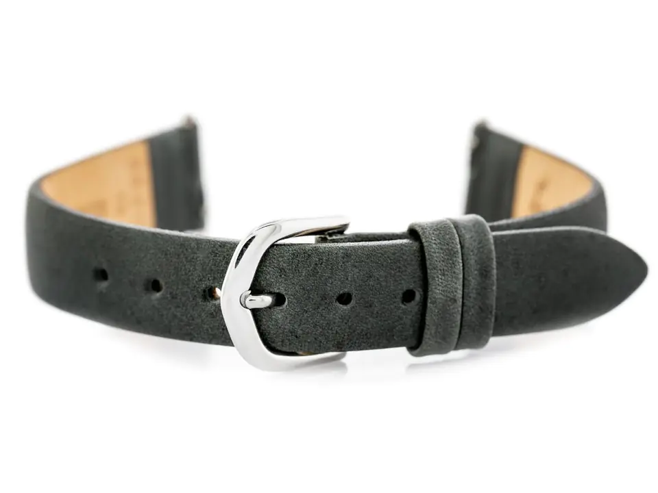 Pasek ze skóry naturalnej w kolorze ciemnoszarym. Klamerka ze stali szlachetnej w kolorze srebrnym.