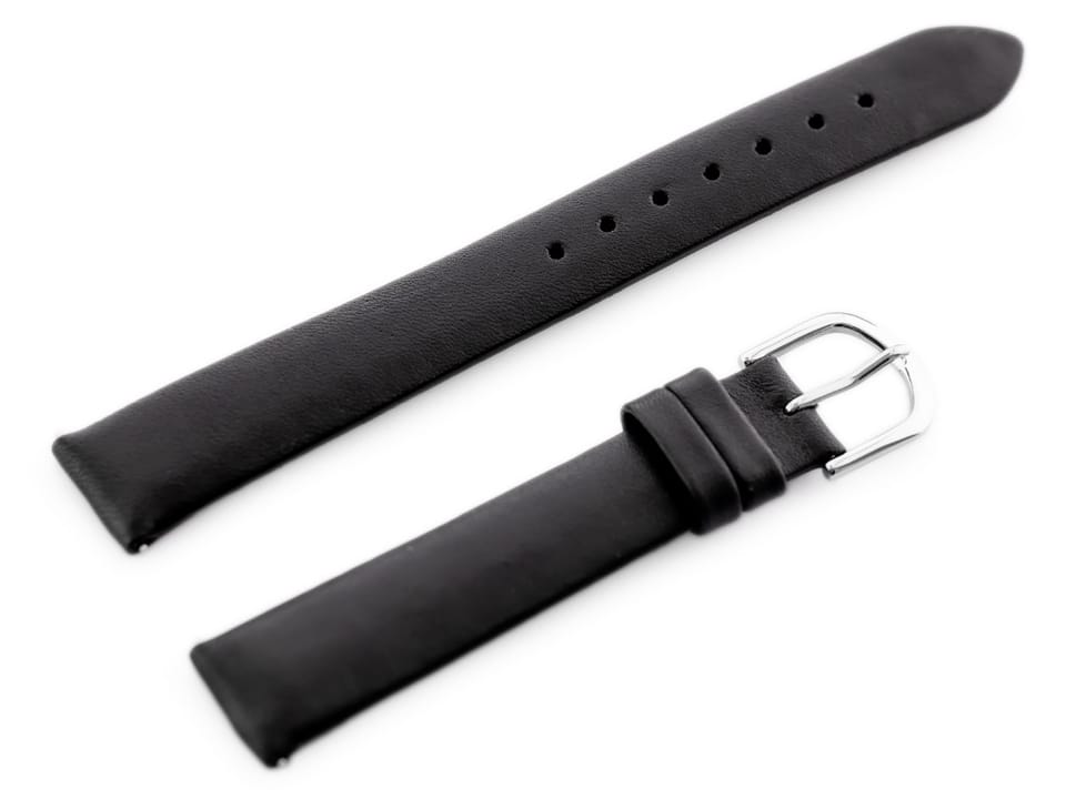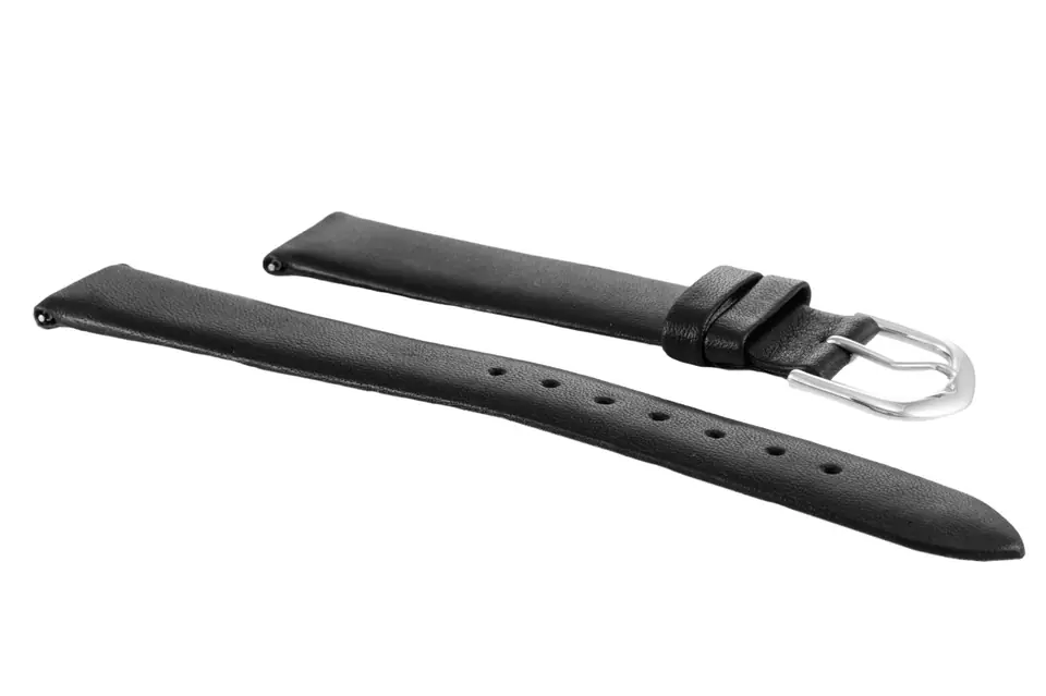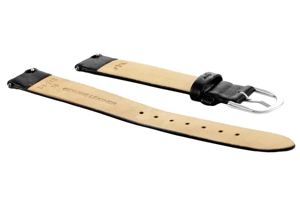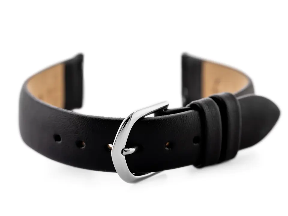 Pasek ze skóry naturalnej w kolorze czarnym. Klamerka ze stali szlachetnej w kolorze srebrnym.
