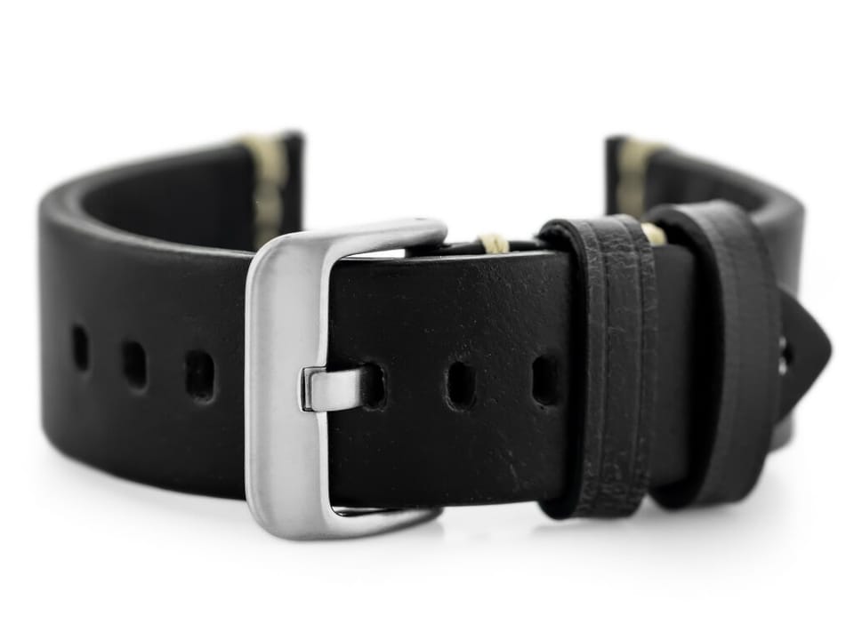 Pasek ze skóry naturalnej w kolorze czarnym z białymi przeszyciami. Klamerka metalowa w kolorze srebrnym.