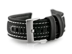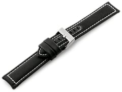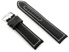 OPIS:Skórzany pasek do zegarka wysokiej jakości. Zewnętrzna część - parciana - w kolorze czarnym z białymi przeszyciami, wewnętrzna cześć - skórzana - w kolorze czarnym.Klamerka metalowa w kolorze srebrnym.