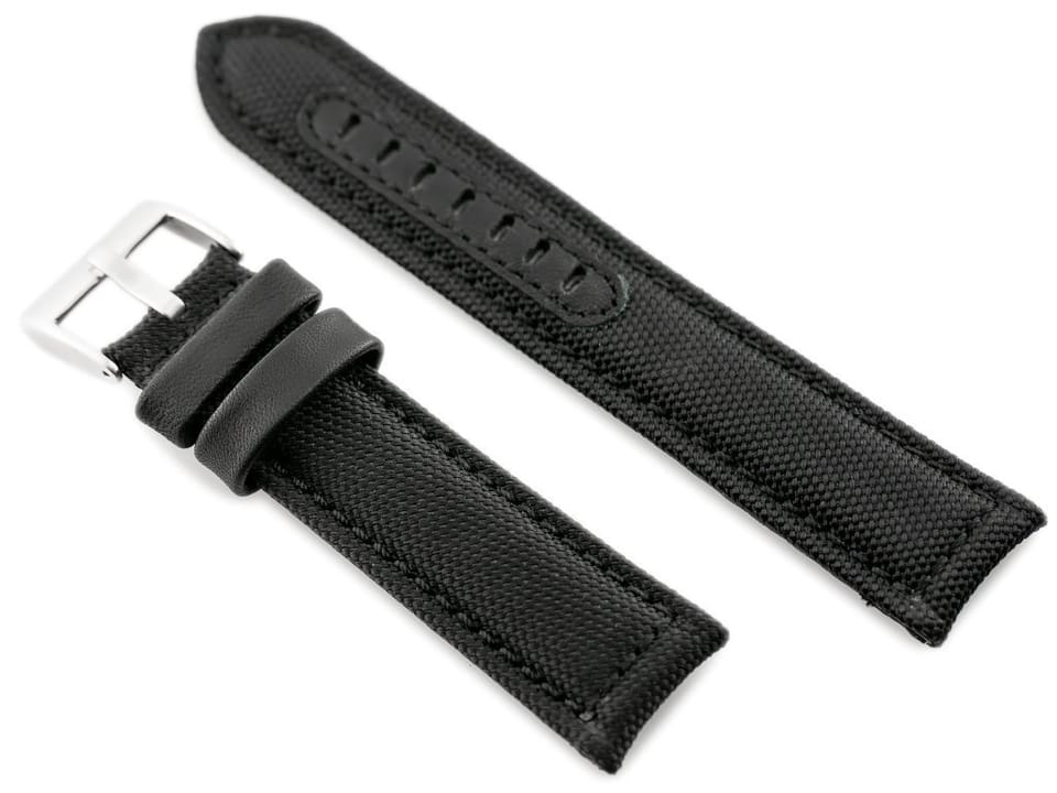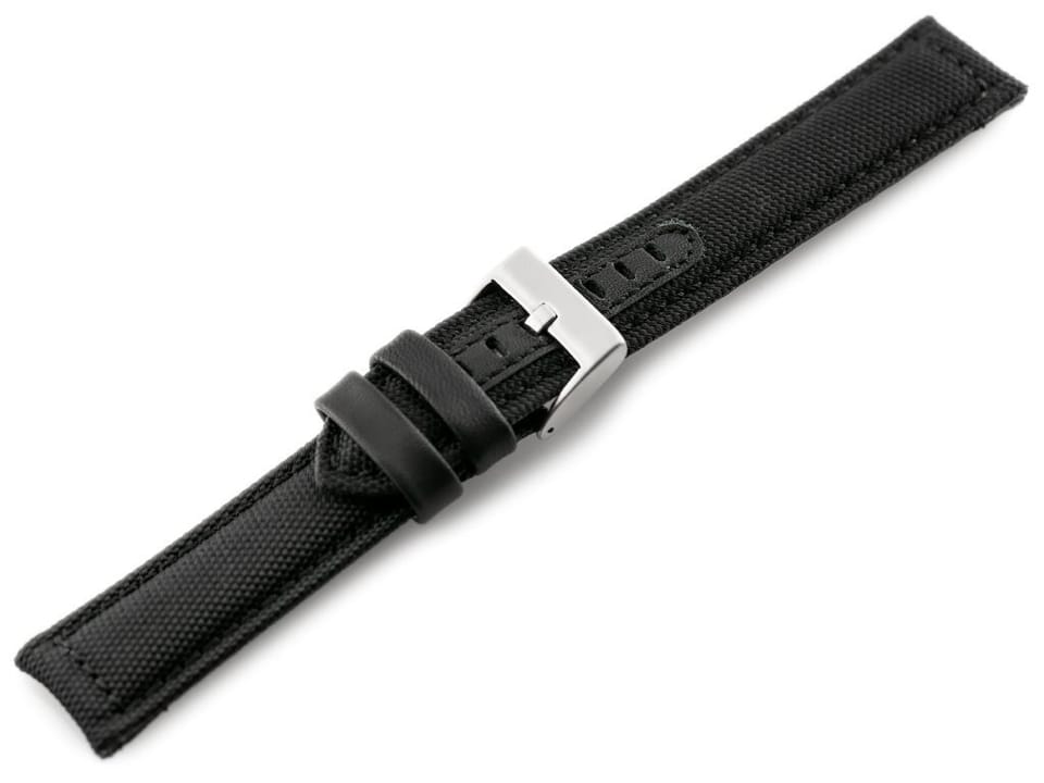 OPIS:Skórzany pasek do zegarka wysokiej jakości. Zewnętrzna część - parciana - w kolorze czarnym z czarnymi przeszyciami, wewnętrzna cześć - skórzana - w kolorze czarnym.Klamerka metalowa w kolorze srebrnym.