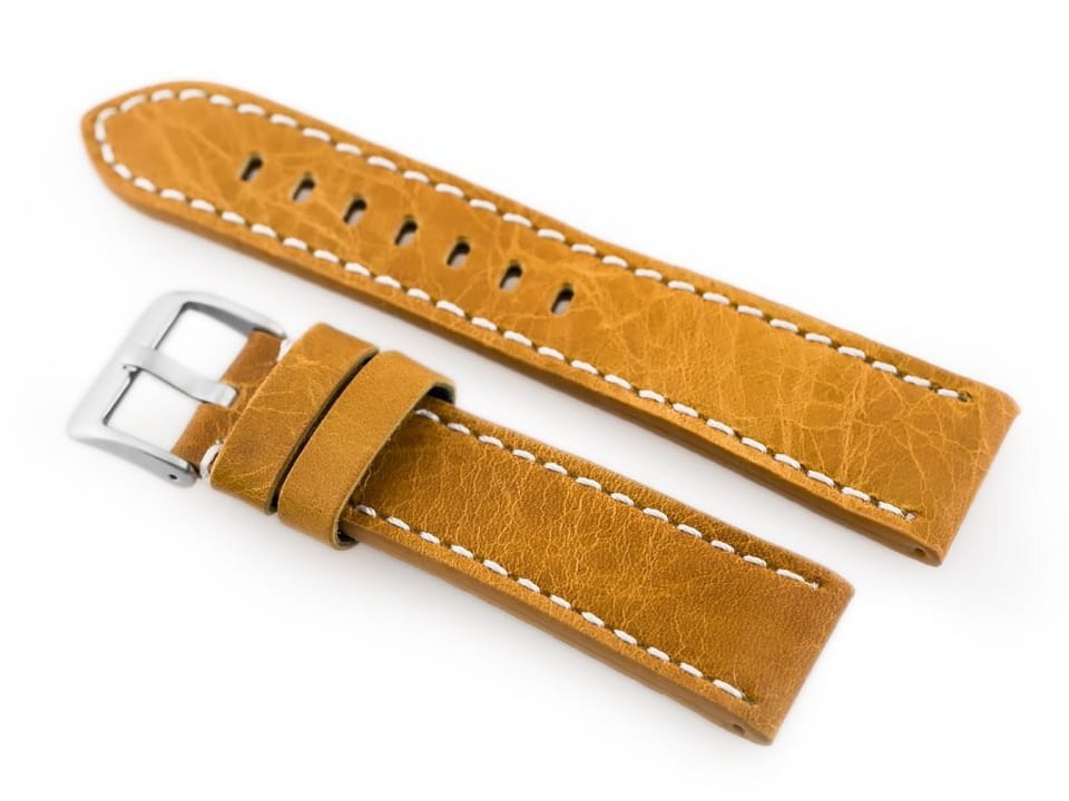 OPIS:Skórzany pasek do zegarka wysokiej jakości w kolorze jasnobrązowym z białymi przeszyciami.Klamerka metalowa w kolorze srebrnym.