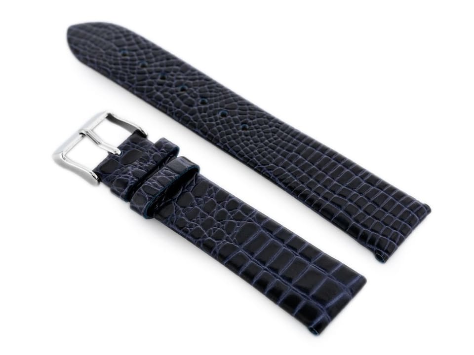 Pasek ze skóry naturalnej w kolorze granatowym. Klamerka metalowa w kolorze srebrnym.