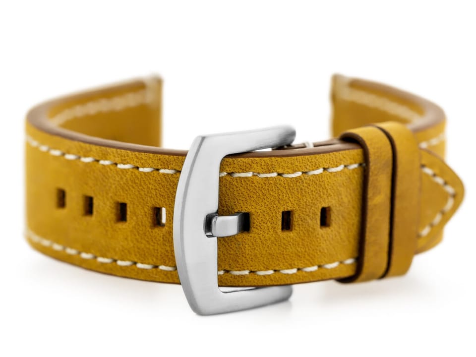 Pasek ze skóry naturalnej w kolorze jasnobrązowym przeszywany białą nicią. Klamerka metalowa w kolorze srebrnym.