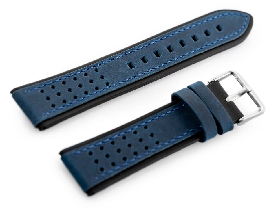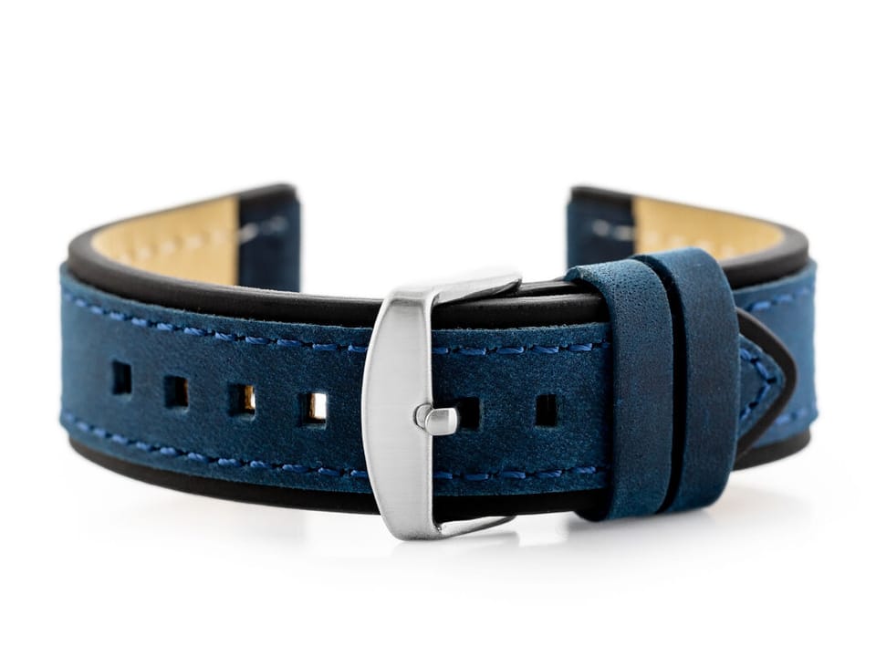 Pasek ze skóry naturalnej w kolorze granatowo-czarnym z granatowymi przeszyciami. Klamerka metalowa w kolorze srebrnym.