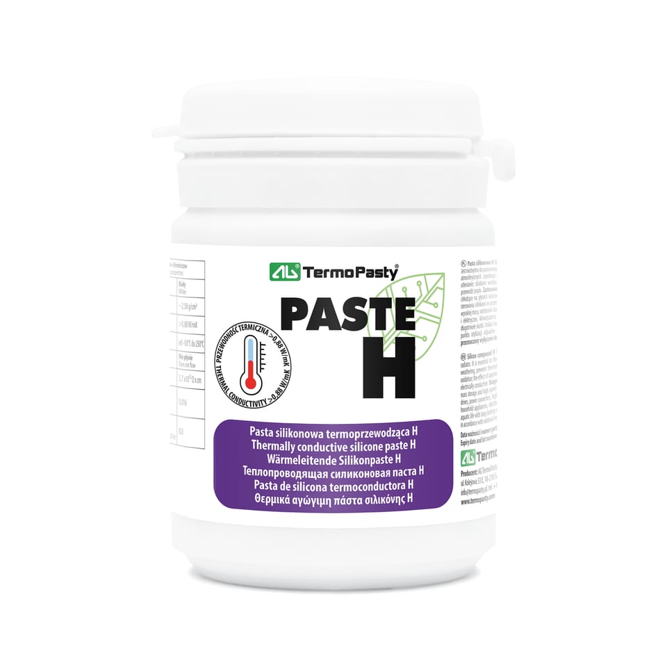 Pasta TermoPrzewodząca silikonowa H – Twoje rozwiązanie na przewodzenie ciepła (>0,88 W/mK) z doskonałą ochronąW dzisiejszych czasach, gdzie elektronika staje się coraz bardziej zaawansowana, a urządzenia pracują pod coraz większym obciążeniem, kluczowe staje się efektywne odprowadzanie ciepła. Oto Pasta TermoPrzewodząca silikonowa H, produkt, który zapewnia przede wszystkim wyjątkową przewodność cieplną powyżej >0,88 W/mK, gwarantując optymalne chłodzenie Twoich urządzeń.Dlaczego Pasta TermoPrzewodząca silikonowa H?Nasza pasta została specjalnie zaprojektowana, aby ułatwić przepływ ciepła między elementami elektronicznymi a radiatorem. Jest nieodzownym elementem w poprawnym działaniu czujników temperatury, chroniąc je przed wpływami atmosferycznymi i zapobiegając przebiciom. Co więcej, jej wyjątkowa formuła charakteryzuje się doskonałą odpornością chemiczną na utlenianie, działanie wodnych roztworów kwasów, zasad i soli, a także dwutlenku siarki i amoniaku. Dodatkowo, jest wysoce odporna na przepływ prądu, co zwiększa bezpieczeństwo jej użytkowania.Szerokie zastosowanie Niezależnie od tego, czy pracujesz nad modułami o wysokim współczynniku przewodzenia ciepła, urządzeniami chłodzącymi, napędami pamięci masowej, układami sterowania silnikami, przetwornikami mocy, diodami LED wysokiej mocy, notebookami, komputerami, urządzeniami komunikacji sieciowej, AGD, podzespołami elektronicznymi i elektrycznymi czy klimatyzatorami – Pasta silikonowa TermoPrzewodząca H jest idealnym rozwiązaniem dla szerokiej gamy aplikacji. Nasz produkt zapewnia bezproblemową pracę w zakresie od -50°C do 250°C, z gęstością 2,58 g/cm3.