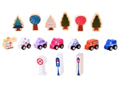 Specyfikacja:- materiał: drewno, tektura - kolorystyka: kolorowe - pastelowe- ilość elementów: 115, a w tym:- ilość klocków: 108- ilość środków transportu: 7- krawędzie: zaokrąglone- wiek: 3+