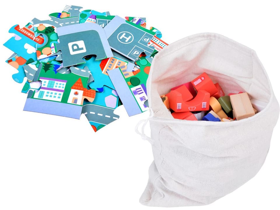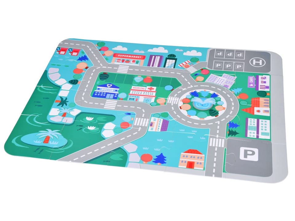 Przed zabawą klockami warto ułożyć puzzle, które przedstawiają miasteczko. Złożona plansza ma wyznaczone miejsca, gdzie można stawiać swoje budowle, ulice, na których poprowadzimy nasze pojazdy; znaki drogowe do nauki jazdy; jak i ozdabiającą oraz dopełniającą obraz roślinność.