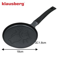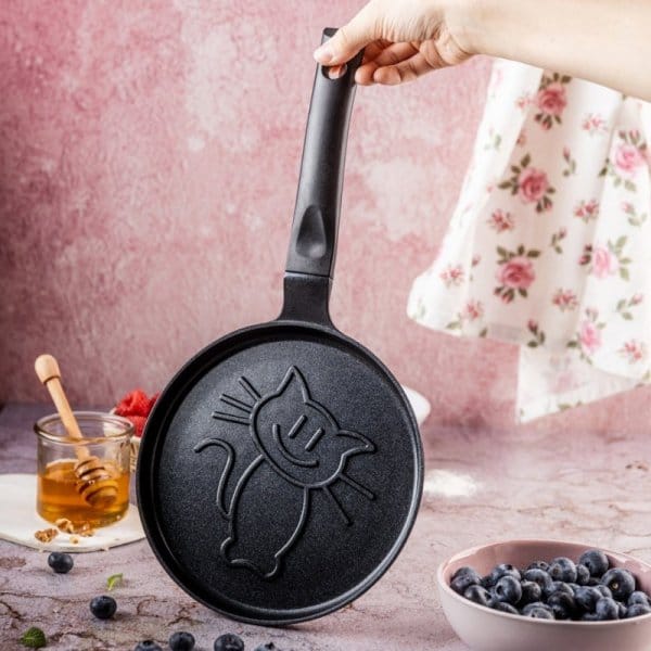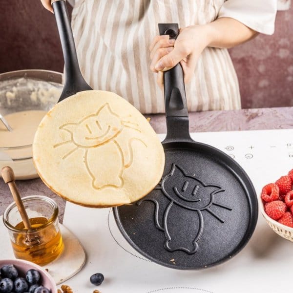 Patelnia KLAUSBERG KB-7973 to połączenie funkcjonalności i uroku w jednym. Została zaprojektowana z myślą o tym, aby codzienne śniadania zamieniały się w przyjemny rytuał pełen radości. Na dnie patelni znajduje się subtelnie wytłoczony wzór wesołego kotka, który po usmażeniu odbija się na powierzchni pankejka lub naleśnika, tworząc efektowny i zabawny motyw.