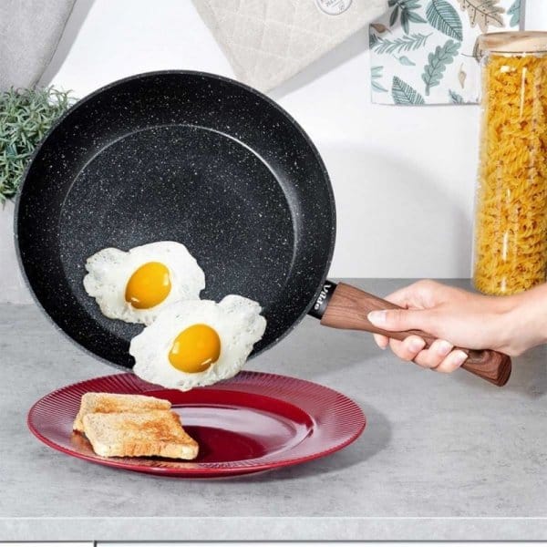 - Nieprzywierająca powłoka granitowa - Patelnia wykonana z aluminium z nieprzywierającą powłoką granitową w czarnym kolorze. Powierzchnia nieprzywierająca umożliwia przygotowywanie zdrowych i smacznych posiłków z minimalną ilością tłuszczu. Wyposażona w uchwyt wykonany z najwyższej jakości, wytrzymałego tworzywa imitującego drewno.