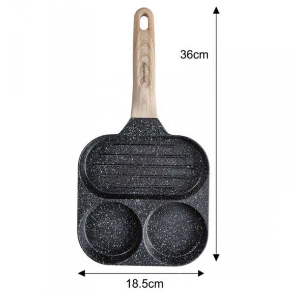 Podział patelni na 3 osobne sekcje umożliwia równoczesne smażenie różnych składników, takich jak jajka, bekon, warzywa czy kiełbaski, bez mieszania się smaków i zapachów. Każda sekcja ma odpowiednią wielkość, dostosowaną do różnych rodzajów jedzenia – mniejsze miejsca sprawdzą się idealnie na jajka, podczas gdy większe pozwolą na podsmażenie warzyw czy mięs. Większa sekcja ma chcarakterystyczne dla patelni grillowych żebrowania co jest szczególnie przydatne przy smażeniu kiełbasek czy plastrów warzyw jak np. cukinia.