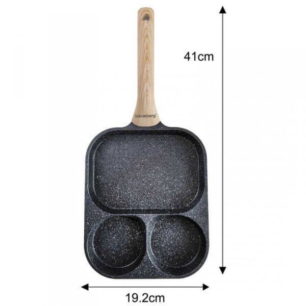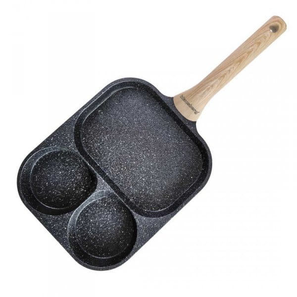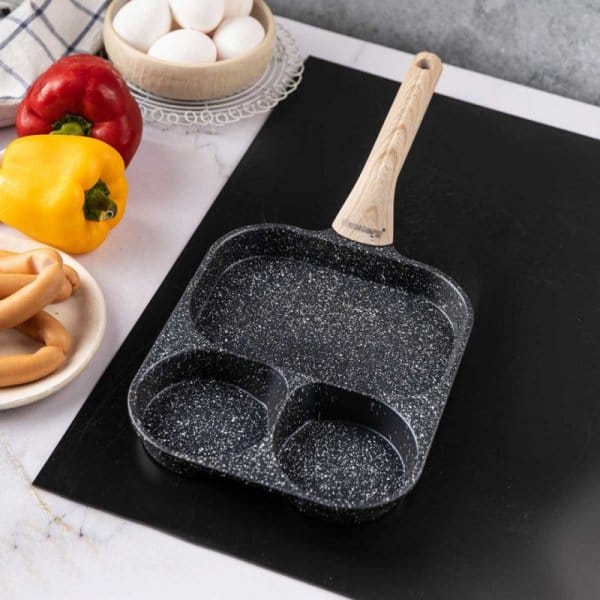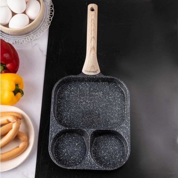 Podział patelni na 3 osobne sekcje umożliwia równoczesne smażenie różnych składników, takich jak jajka, bekon, warzywa czy kiełbaski, bez mieszania się smaków i zapachów. Każda sekcja ma odpowiednią wielkość, dostosowaną do różnych rodzajów jedzenia – mniejsze miejsca sprawdzą się idealnie na jajka, podczas gdy większe pozwolą na podsmażenie warzyw czy mięs.