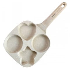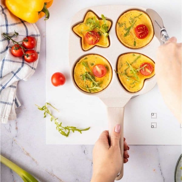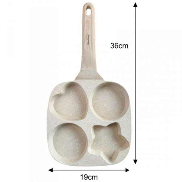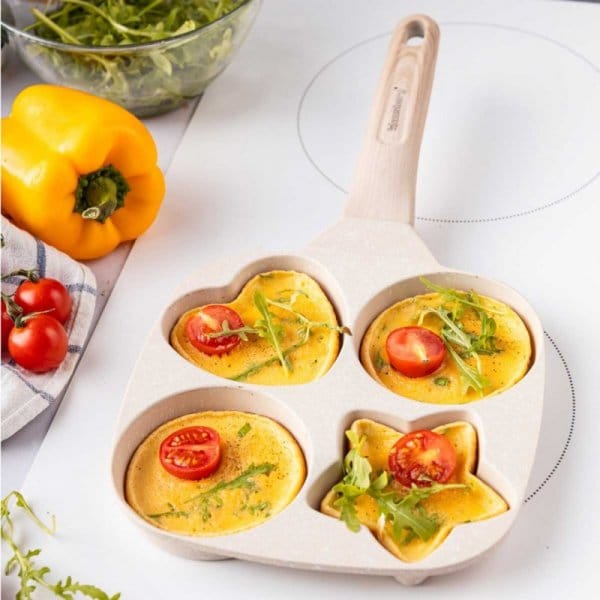 Patelnia z powłoką marmurową i podziałem na 4 sekcje do smażenia jajek lub placuszków w różnych kształtach. Powłoka marmurowa zapewnia wysoką odporność na zarysowania oraz wyjątkowe właściwości nieprzywierające, co pozwala na smażenie z minimalną ilością tłuszczu. Na patelni możemy usmażyć jednoczęśnie placki lub jajka w kształcie gwiazdki, serca oraz okrągłe.