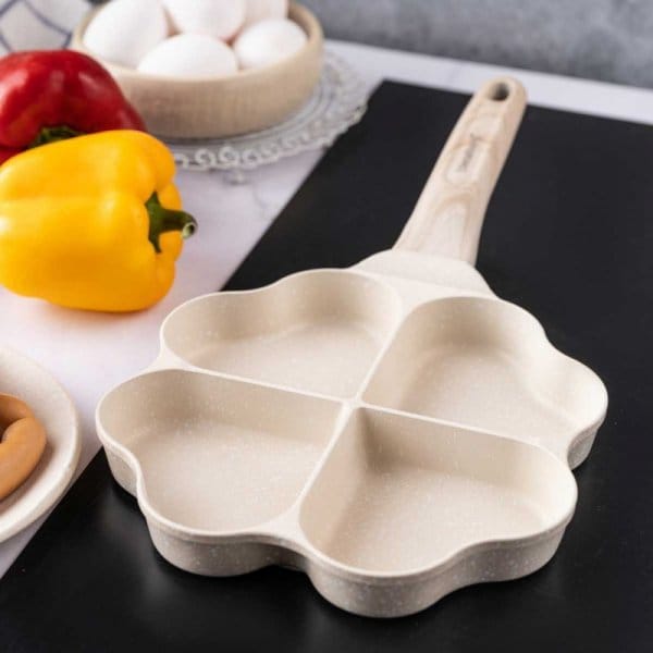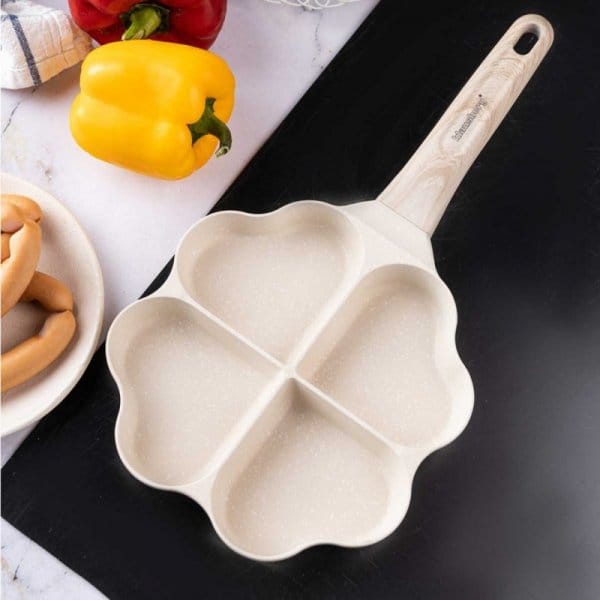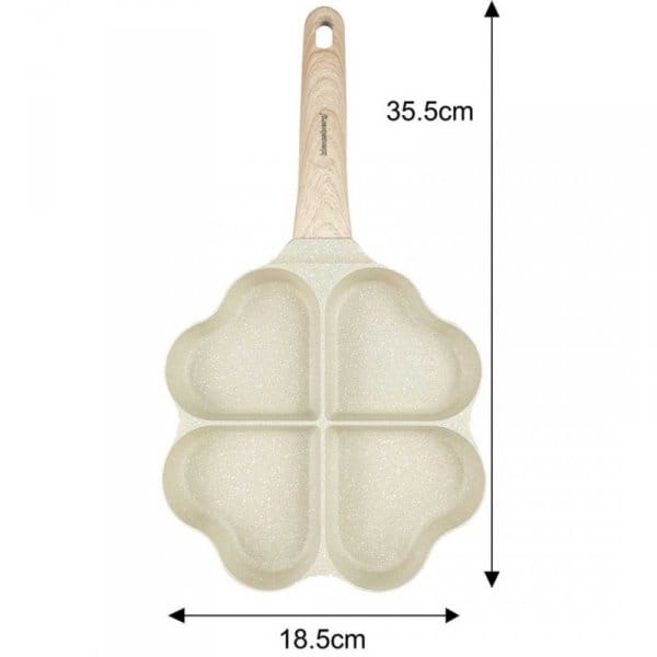 Patelnia z powłoką marmurową i podziałem na 4 sekcje do smażenia jajek lub placuszków w kształcie serduszek. Powłoka marmurowa zapewnia wysoką odporność na zarysowania oraz wyjątkowe właściwości nieprzywierające, co pozwala na smażenie z minimalną ilością tłuszczu.
