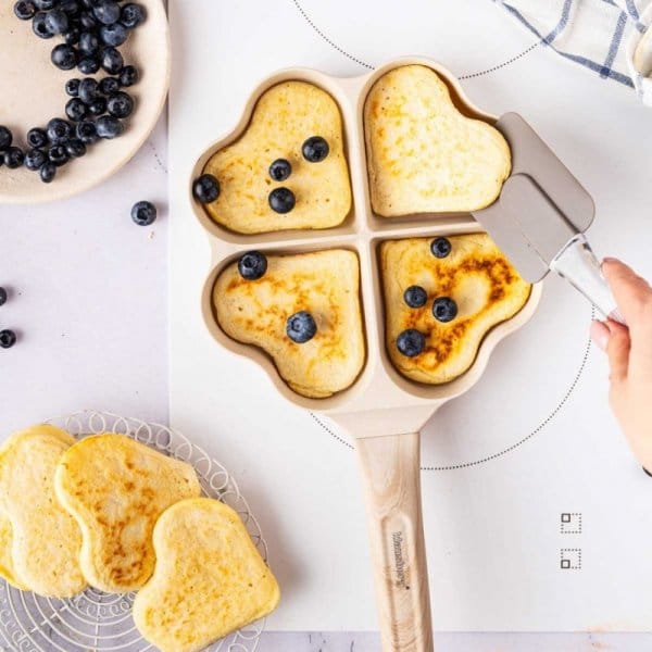 Patelnia posiada ergonomiczny, nienagrzewający się uchwyt imitujący drewno, który zapewnia wygodę i bezpieczeństwo podczas użytkowania. Jej solidna konstrukcja równomiernie rozprowadza ciepło, co pozwala na szybkie i efektywne przygotowanie posiłków. Jest kompatybilna z większością typów kuchenek, w tym indukcyjnych. To wszechstronne i praktyczne naczynie będzie doskonałym wyborem zarówno do szybkich śniadań, jak i kolacji, pozwalając oszczędzić czas i energię a przygotowane na niej jajka czy placki będą miały kształt serduszek.