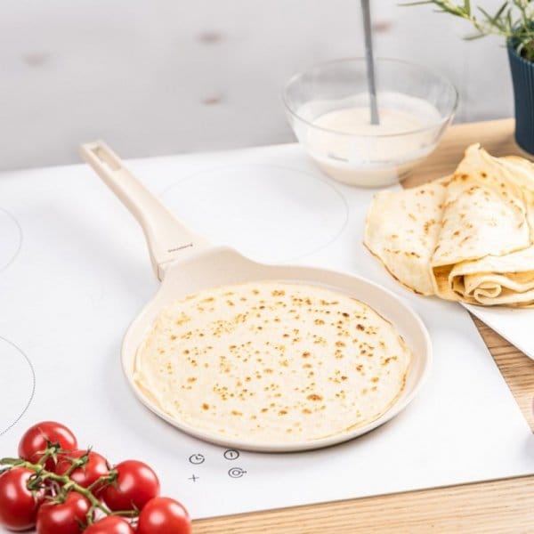 - Niskie ścianki i szeroki rant – wygodne nalewanie i przewracanie naleśników.