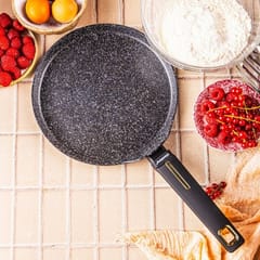 Dzięki solidnej konstrukcji z aluminium oraz nieprzywierającej powłoce typu „marble”, patelnia równomiernie rozprowadza ciepło, a każdy naleśnik smaży się równo od brzegu po środek. Działa na wszystkich rodzajach kuchenek, w tym na indukcji, i nadaje się do mycia w zmywarce.