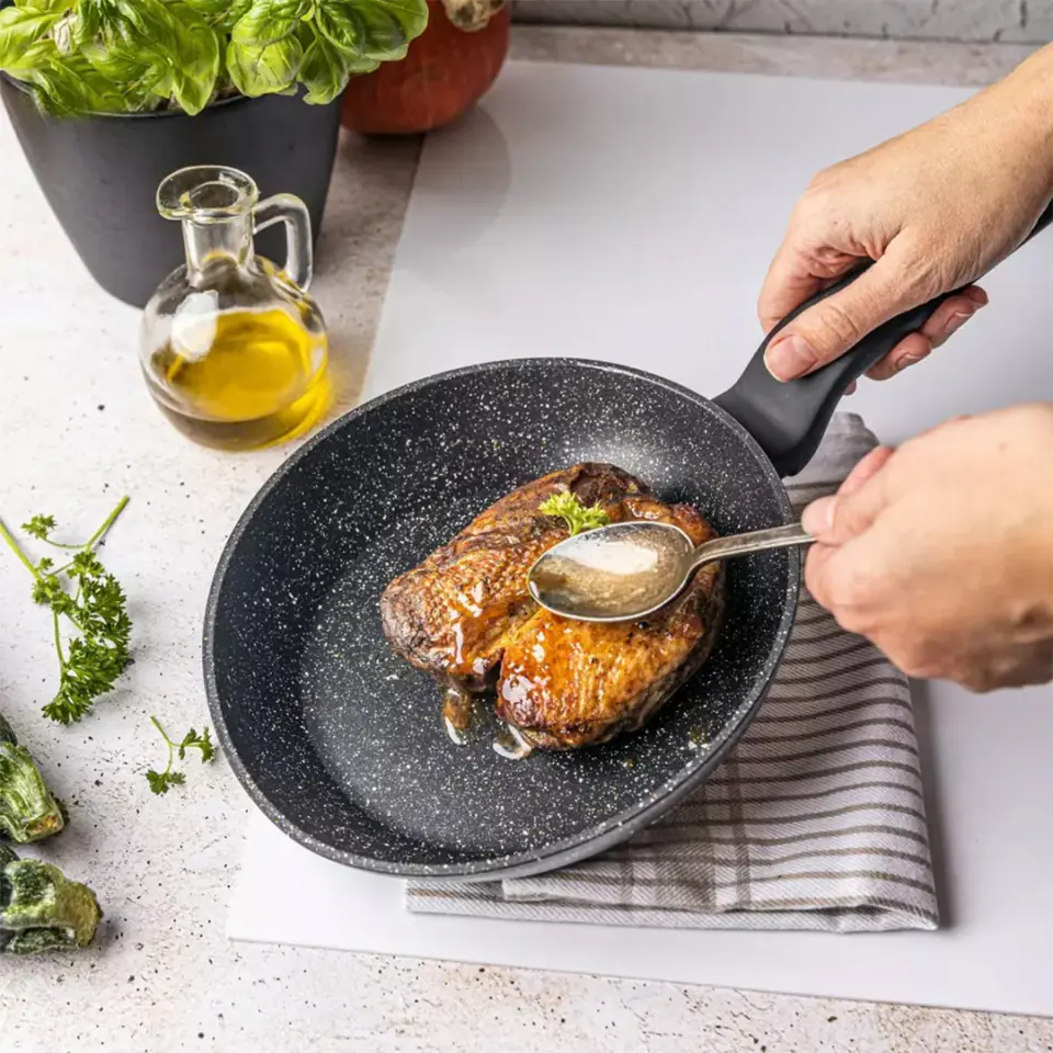 Patelnia z niezwykle trwałą powłoką marmurkową.  Ekskluzywny design spotyka się z niezrównaną funkcjonalnością, czyniąc tą patelnię idealnym rozwiązaniem dla każdego nowoczesnego kucharza.