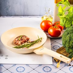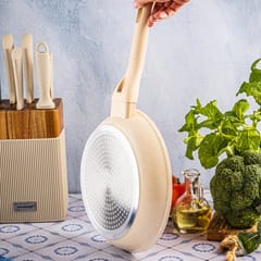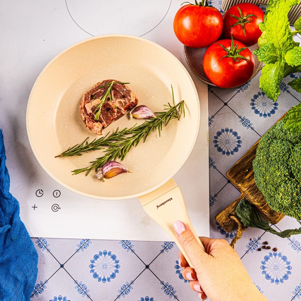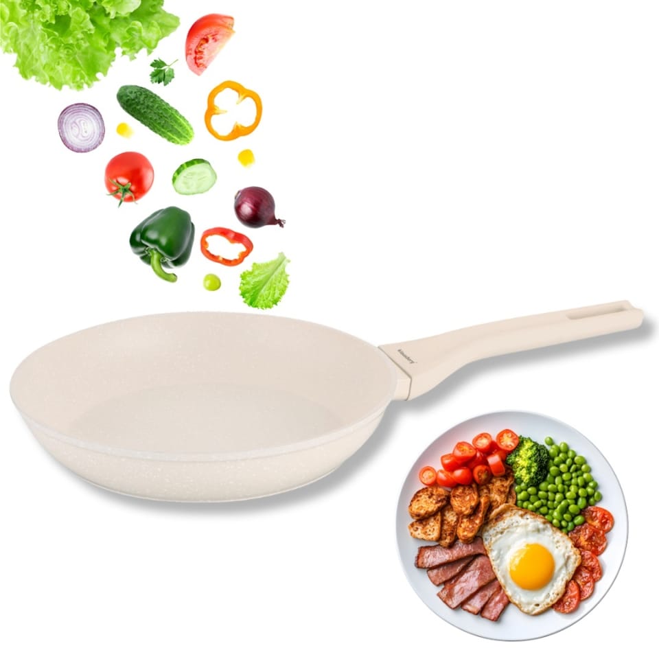 Klausberg KB-7989 to elegancka, kremowa patelnia o średnicy 24 cm, idealna do przygotowywania codziennych potraw — od mięsa i ryb, po warzywa, jajka i naleśniki. Marmurowa powłoka non-stick gwarantuje komfortowe smażenie bez przywierania oraz możliwość ograniczenia ilości tłuszczu. Jasny kolor z delikatnym wzorem sprawia, że patelnia świetnie komponuje się z nowoczesnymi, jasnymi kuchniami. To naczynie, które sprawdzi się zarówno w domu, jak i w kuchniach, gdzie liczy się niezawodność sprzętu.