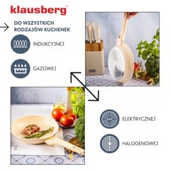Czy patelnia działa na indukcji? Tak. Patelnia Klausberg KB-7989 posiada ferromagnetyczne dno i jest kompatybilna z kuchenkami indukcyjnymi.