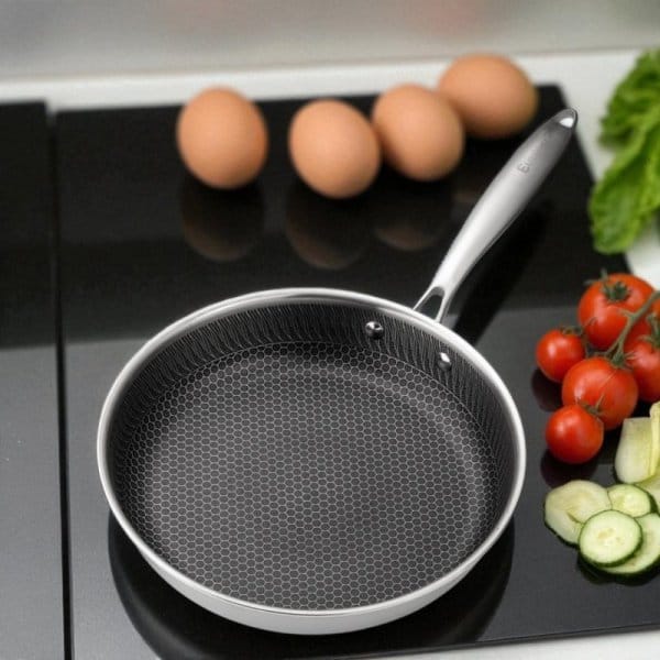 Patelnie stalowe z powłoką typu plaster miodu – profesjonalna trwałość i wygodaPatelnia stalowa z powłoką typu plaster miodu to nowoczesne naczynie kuchenne stworzone z myślą o intensywnym użytkowaniu. Wykonana z wysokiej jakości stali nierdzewnej, wyróżnia się wyjątkową odpornością na uszkodzenia mechaniczne oraz działanie wysokiej temperatury. Jej powierzchnia pokryta jest specjalną strukturą przypominającą plaster miodu, która pełni funkcję ochronną dla powłoki nieprzywierającej.Dzięki temu rozwiązaniu patelnia jest bardziej trwała, odporna na zarysowania i bezpieczna w kontakcie z metalowymi akcesoriami kuchennymi. Powłoka umożliwia zdrowsze smażenie przy minimalnej ilości tłuszczu, a jednocześnie zapobiega przywieraniu potraw.Zalety patelni stalowej z powłoką plaster miodu: solidna konstrukcja ze stali nierdzewnej, innowacyjna powierzchnia o strukturze plastra miodu, odporność na zarysowania i uszkodzenia, nitowany uchwyt możliwość smażenia z minimalną ilością tłuszczu, równomierne nagrzewanie i utrzymywanie ciepła, kompatybilność z wszystkimi rodzajami kuchenek, także indukcyjnymi, łatwe czyszczenie i higieniczne użytkowanie. Rozmiar: Ø26 x 5,3 cmPatelnia z powłoką typu plaster miodu to doskonały wybór zarówno dla profesjonalnych kuchni, jak i do codziennego użytku domowego. Łączy w sobie nowoczesny design, funkcjonalność oraz wytrzymałość, zapewniając komfort smażenia przez długie lata. ...
