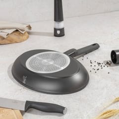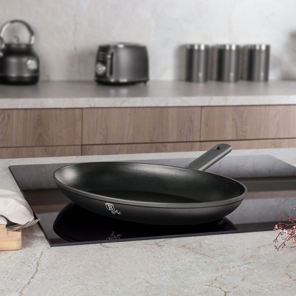 Garnki, patelnie i akcesoria z serii ANTRACIT COLLECTION firmy BERLINGER HAUS wykonane są z wysokiej klasy aluminium pokrytego wewnątrz potrójną powłoką tytanową TYTAN PRO o bardzo wysokim współczynniku twardości. Powłoka zewnętrzna w kolorze antracytowym matowym. Te atrakcyjne i modne naczynia wyposażone są standardowo w uchwyty typu SOFT TOUCH (silikon handle). Przystosowane do wszystkich rodzajów kuchenek: gazowa, elektryczna, ceramiczna, halogenowa, indukcyjna. System TURBO INDUCTION (bardzo szybko nagrzewają się) pozwala zaoszczędzić nawet 35% energii.