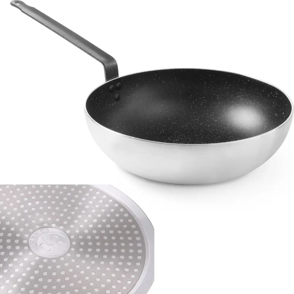 Numer producenta: Hendi 627730Wok z nieprzywierającą marmurkową powłoką marki Hendi to naczynie, które znajdzie zastosowanie w często uczęszczanych restauracjach, hotelach serwujących posiłki i innych punktach gastronomicznych. Dzięki wykonaniu z twardego odlewu aluminium patelnia bardzo szybko się nagrzewa, a indukcyjne dno sprawia, że może pracować z każdym typem kuchenek.Cechy i funkcje: