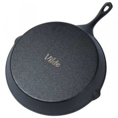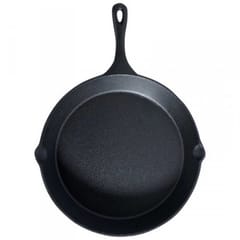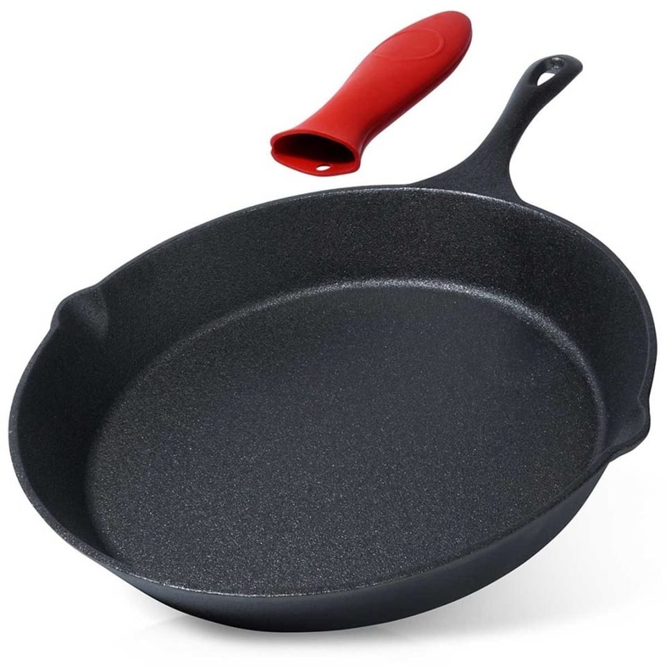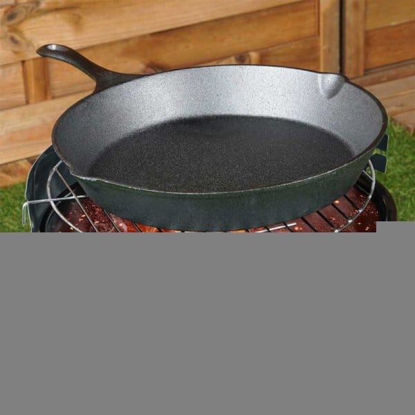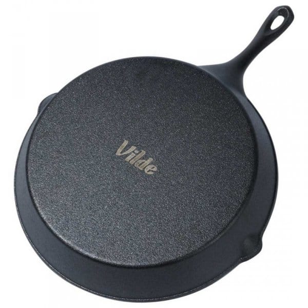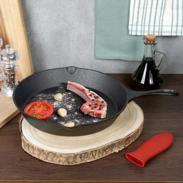 Patelnia żeliwna o średnicy 30 cm w zestawie z ochronną nakładką silikonową na rączkę patelni. Można stosować ją na indukcji, w piekarnikach, na piecu i bezpośrednio na grillu.