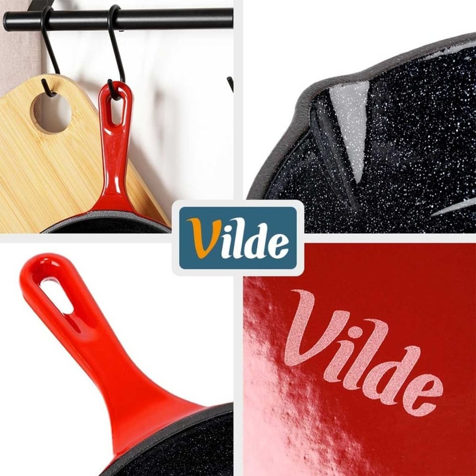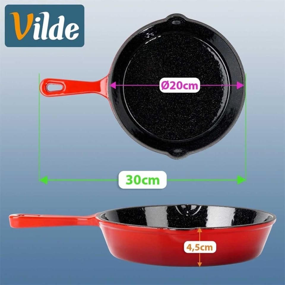 Okrągła patelnia żeliwna idealna do przygotowywania różnego rodzaju potraw. Patelnia zapewnia szybkie i jednolite smażenie. Możemy użytkować ją w każdej kuchence, ale również bezpośrednio na grillu, czy ogniu. Patelnia jest niezwykle solidna i ciężka. Żeliwo rozgrzewa się równomiernie i długo utrzymuje ciepło, dzięki czemu serwowane dania dłużej będą ciepłe. W zestawie nakładka na rączkę patelni. Sprawdzi się w domu, a także podczas biwaków, wycieczek pod namiot czy innych wyjazdów. Oryginalny produkt marki Vilde z linii Cast Enamel. Wyprodukowano zgodnie z europejskimi standardami.