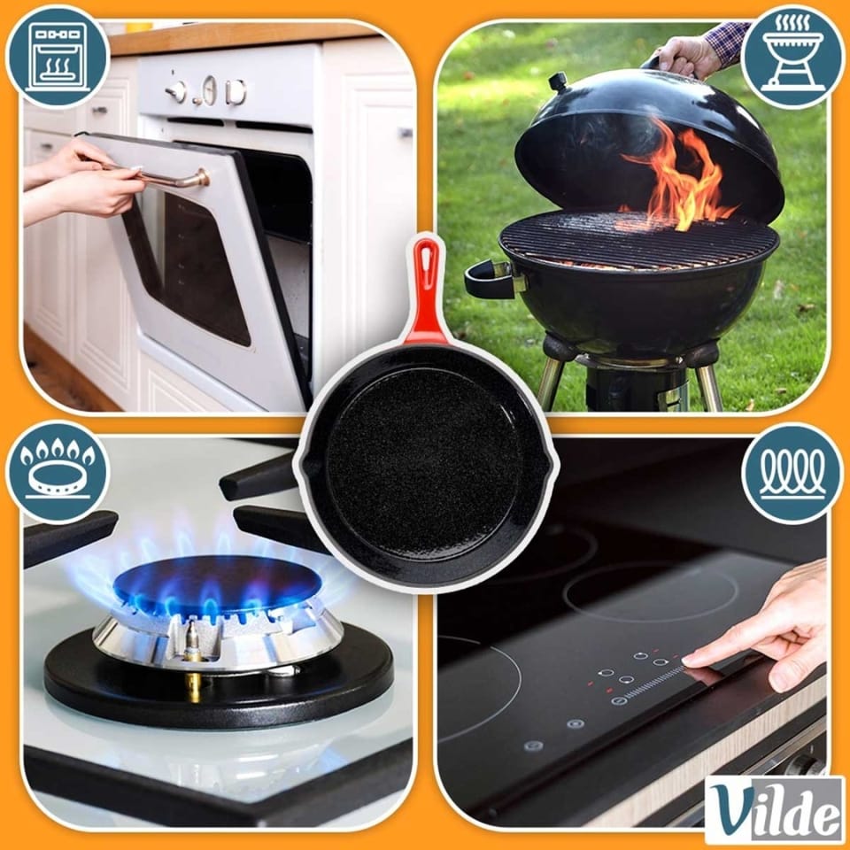 - Uniwersalne zastosowanie - Patelnia idealnie nadaje się do smażenia, duszenia, pieczenia i przygotowywania wszelkiego rodzaju dań czy przekąsek. Sprawdzi się do przyrządzenia pysznego i aromatycznego jedzenia w każdej kuchni, na kempingu czy podczas grillowania. Patelnię wykorzystamy również do bezpośredniego serwowania dań np. pieczonych ziemniaczków. Nadaje się na kuchnie gazowe, elektryczne, ceramiczne oraz indukcję.