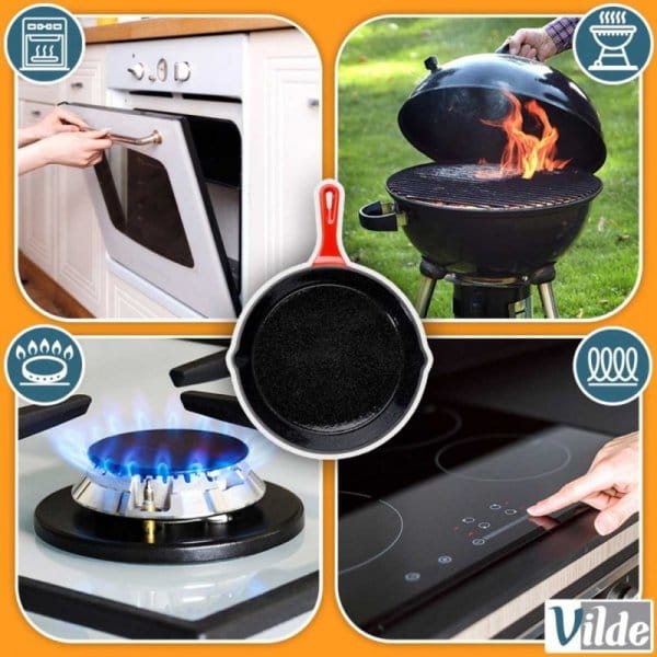 Patelnia żeliwna o średnicy 25 cm w zestawie z ochronną nakładką silikonową na rączkę patelni. Można stosować ją na indukcji, w piekarnikach, na piecu i bezpośrednio na ogniu.