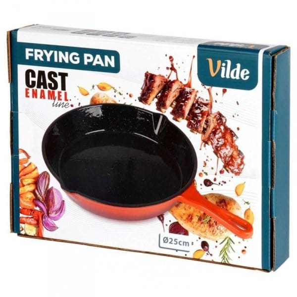 Okrągła patelnia żeliwna idealna do przygotowywania różnego rodzaju potraw. Patelnia zapewnia szybkie i jednolite smażenie. Możemy użytkować ją w każdej kuchence, ale również bezpośrednio na grillu, czy ogniu. Patelnia jest niezwykle solidna i ciężka. Żeliwo rozgrzewa się równomiernie i długo utrzymuje ciepło, dzięki czemu serwowane dania dłużej będą ciepłe. W zestawie nakładka na rączkę patelni. Sprawdzi się w domu, a także podczas biwaków, wycieczek pod namiot czy innych wyjazdów. Oryginalny produkt marki Vilde z linii Cast Enamel. Wyprodukowano zgodnie z europejskimi standardami.