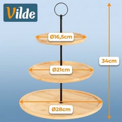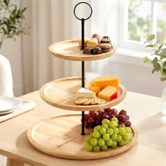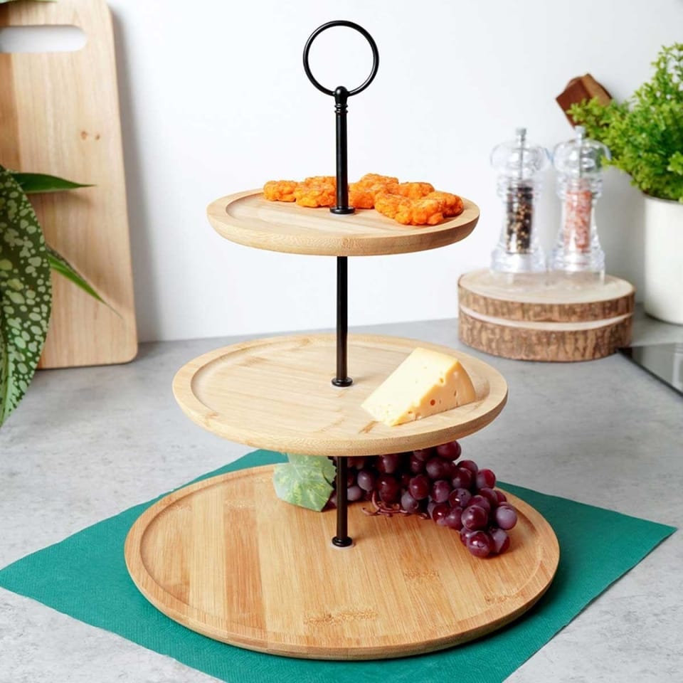 Piętrowa patera na ciastka, ciasto, owoce, przystawki, przekąski. Posiada 3 poziomy składające się z tac wykonanych z drewna bambusowego.