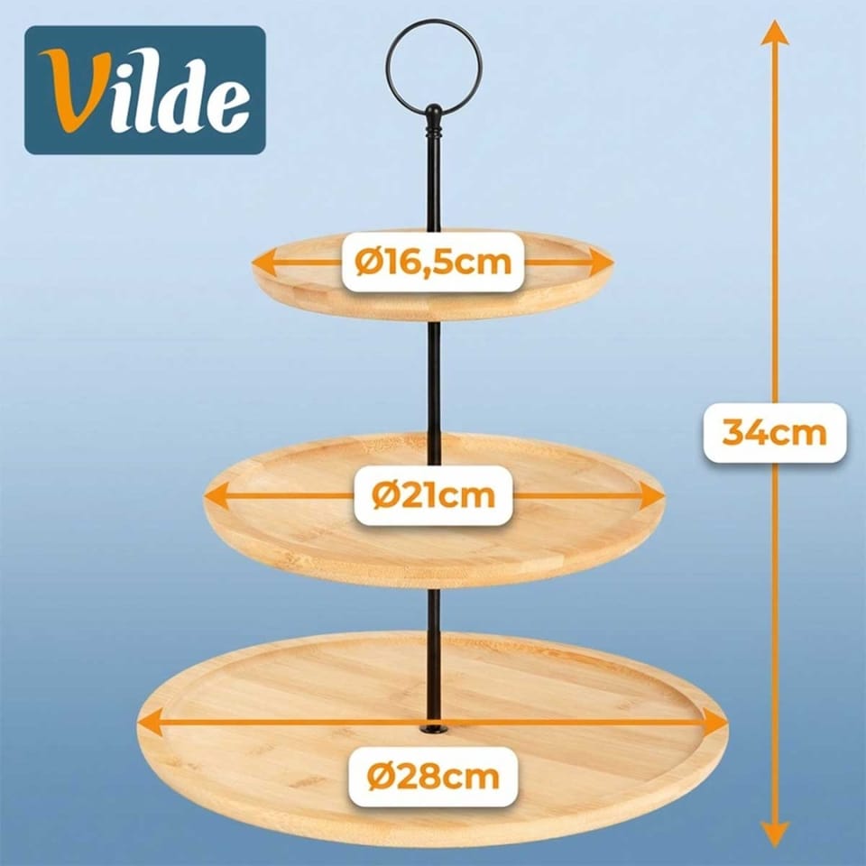 Trzypiętrowa patera umożliwia efektowne i wygodne serwowanie różnorodnych potraw. Wykonana z wytrzymałych materiałów, jest łatwa w czyszczeniu i wygodna w użytkowaniu. Świetnie prezentować się będą na niej babeczki, ciasteczka, różnego rodzaju desery, owoce, kanapki, ale także przystawki i potrawy. Patera idealnie sprawdzi się do przygotowania słodkich stołów. Z jej pomocą wyeksponujemy na stole słodkości oraz słone przekąski. Sprawdzi się do użytku domowego oraz profesjonalnego. Oryginalny produkt marki Vilde. Wyprodukowano zgodnie z europejskimi standardami.