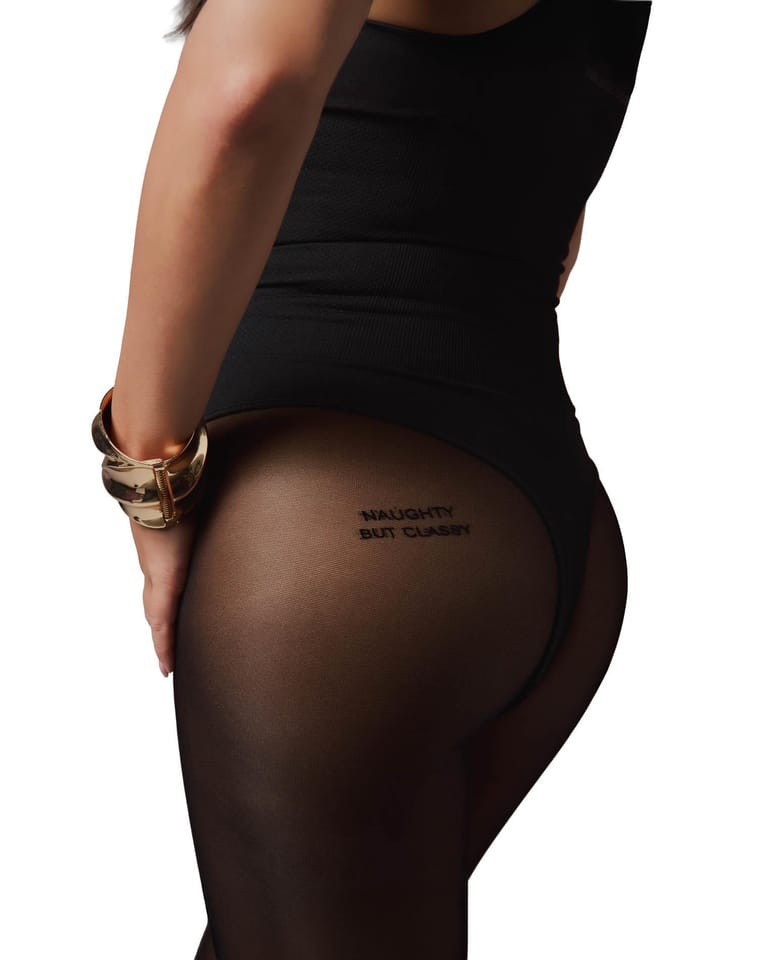 Rajstopy wykonane z półtransparentnego, elastycznego materiału, które zmysłowo podkreślają linię nóg i nadają stylizacji odważnego charakteru.Subtelny, dekoracyjny napis „naughty but classy” umieszczony na lewym pośladku zalotnie przyciąga wzrok i dodaje figlarnej pewności siebie.Delikatna struktura materiału tworzy kuszący efekt prześwitu, idealny na wieczorne stylizacje i intymne chwile.Komfortowy pas w talii zapewnia wygodne dopasowanie i swobodę noszenia.Połączenie poliamidu i elastanu gwarantuje elastyczność, trwałość i przyjemność w dotyku.Produkt został zaprojektowany w Unii Europejskiej, z dbałością o detale i jakość wykonania.Cechy produktu:Ozdoba: kokieteryjny napis na pośladku.Materiał: półtransparentny.Pas: komfortowy w talii.Skład: 84% poliamid, 16% elastan.Projekt: UE.Uwaga: produkt nieodpowiedni dla dzieci poniżej 3 lat – ryzyko zadławienia drobnymi elementami.