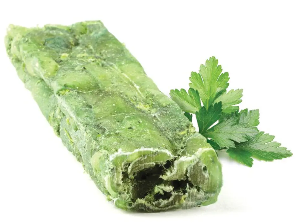 Skład:92% skóra wołowa, 2,5% żwacz wołowy, 2,5% penis wołowy, 1% minerały (fosforan dwuwapniowy, węglan wapniowo-magnezowy, węglan wapnia z muszli ostryg, tlenek magnezu), pietruszka, chlorofil, lizozymAnaliza odżywcza: