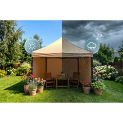 Dach i ściany namiotu wykonano z PVC i są one w stu procentach wodoodporne. Zapewniają niezawodną osłonę przed deszczem – jak również przed słońcem i wiatrem. Dlatego pawilon Plonos jest uniwersalny; nadaje się do użytkowania w zróżnicowanych warunkach atmosferycznych, nawet przy niesprzyjającej pogodzie.