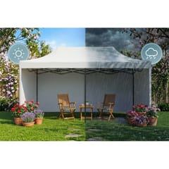 Dach i ściany namiotu wykonano z PVC i są one w stu procentach wodoodporne. Zapewniają niezawodną osłonę przed deszczem – jak również przed słońcem i wiatrem. Dlatego pawilon Plonos jest uniwersalny; nadaje się do użytkowania w zróżnicowanych warunkach atmosferycznych, nawet przy niesprzyjającej pogodzie.